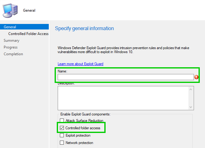 If you’ve opted to create a new policy enter a name and description for the new policy. If you’ve like to enable other security features as part of this policy, select those security settings at the bottom of the window and select Controlled Folder Access.