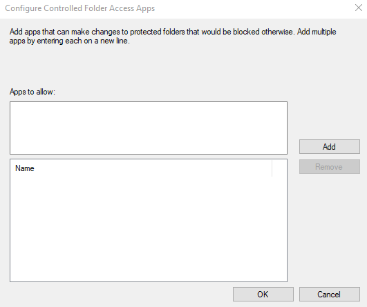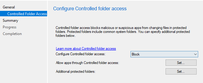 The next window will present the main options that can be configured as part of the Controlled Folder Access. The setting ‘Configure Controlled Folder Access’ is essentially turning the feature on. It can be enabled in four different ways, these will be explained in the next step. The ‘Allow apps through Controlled Folder Access’ is excatley how it sounds. These exceptions will include applications such as Word to be able to export files directly to the users home directory folders such as Desktop and Documents. The final option ‘Additional protected folders’ is to add any custom folders that need protecting with Controlled Folder Access. These may include financial folders located under C:/. Both allowing apps and additional protected folders are both configurable through this page.